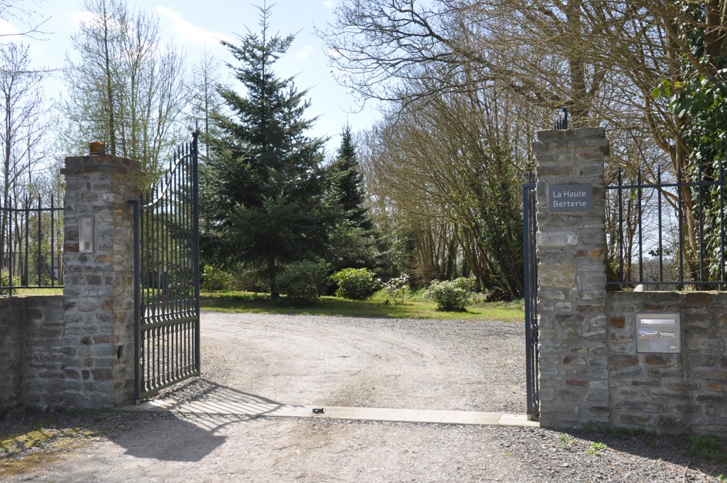 Le gîte de La Haute Berterie est la dernière maison à droite - Grille en fer forgé - 2 piliers de pierres et indication sur le pilier de droite : "La Haute Berterie"